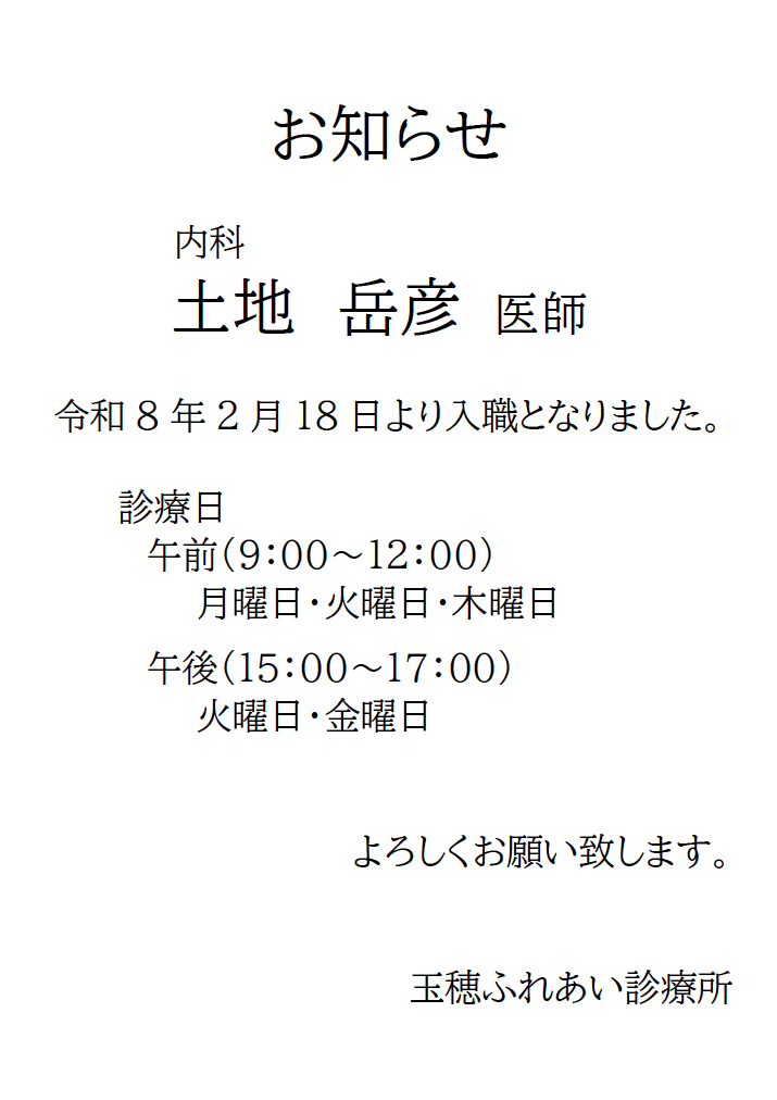お知らせ クリニック 内科 土地岳彦医師が入職となりました。(令和8年2月18日) 2026年2月18日 令和8年2月18日から、内科土地岳彦医師が入職となりました。 診療日 午前(9:00〜12:00)月曜日・火曜日・木曜日 午後(15:00〜17:00)火曜日・金曜日 ホーム 目次ページ 記事を一覧表示 カテゴリーカテゴリー カテゴリーを選択 お知らせ クリニック 行事などのご案内 パルシップの会 小児科 支援の会 支援の会お知らせ 支援の会カレンダー 支援の会つくしんぼ 支援の会ホスピス祭り 未分類 活動報告 ふれあい ほのぼの日記 写真館 忘れな草の会 患者さん、ご家族の声 玉穂ふれあいだより 社会貢献 東日本被災地支援活動