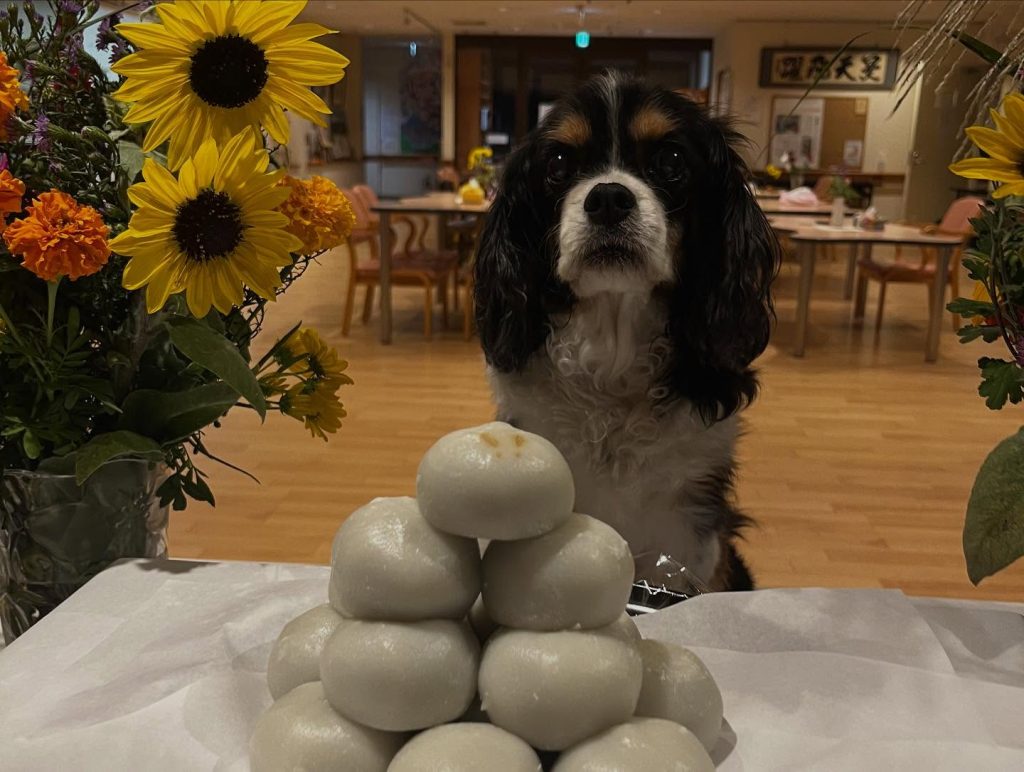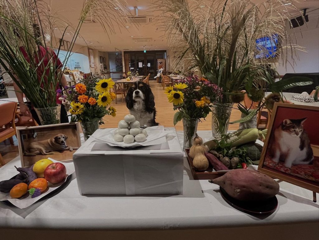 毎年、すすきやお花、秋の野菜や果物をお供えして、月を眺めます。去年まではセラピードッグのリリーと、セラピーキャットのビリーも一緒でしたが、今年はラッシーだけ。